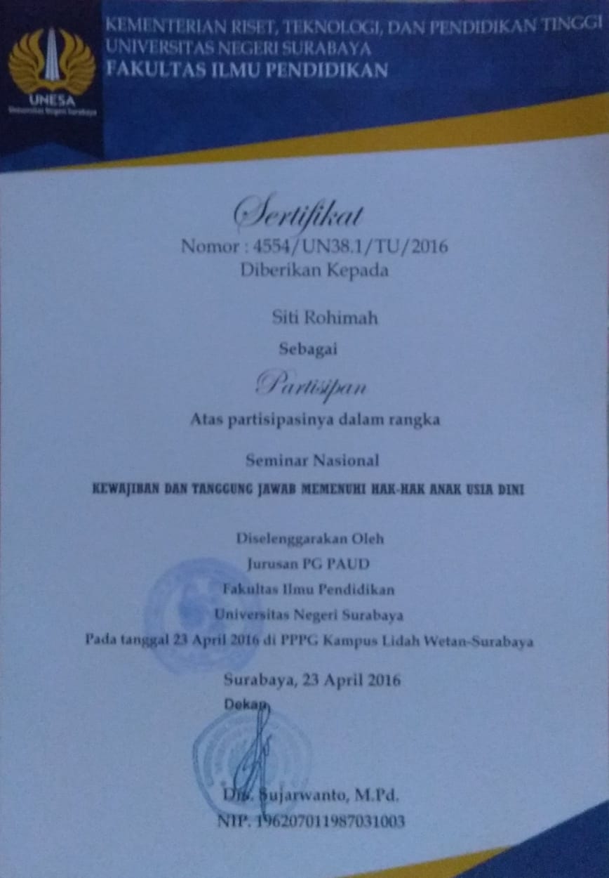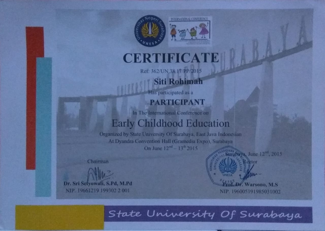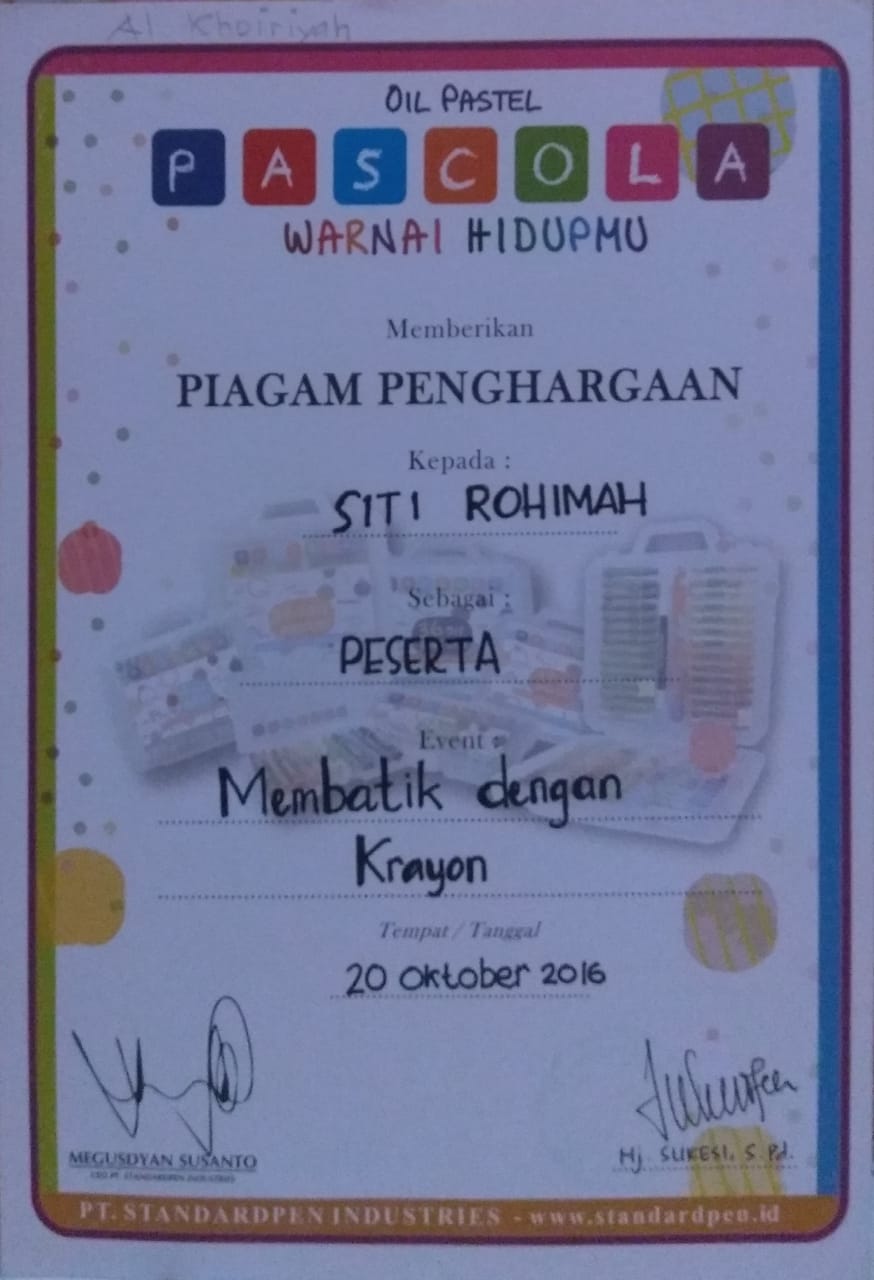 Nama saya Siti Rohimah, A. Ma. Saya seorang guru di KB-TK Terpadu Alkhairiyah Surabaya. Saya lahir di Bangkalan, 20 Oktober 1986. Saya saat ini mengajar di kelas TK B2 sebagai wali kelas. Hobi saya adalah berolahraga karena dengan berolahraga bisa membuat badan saya sehat, segar dan bugar